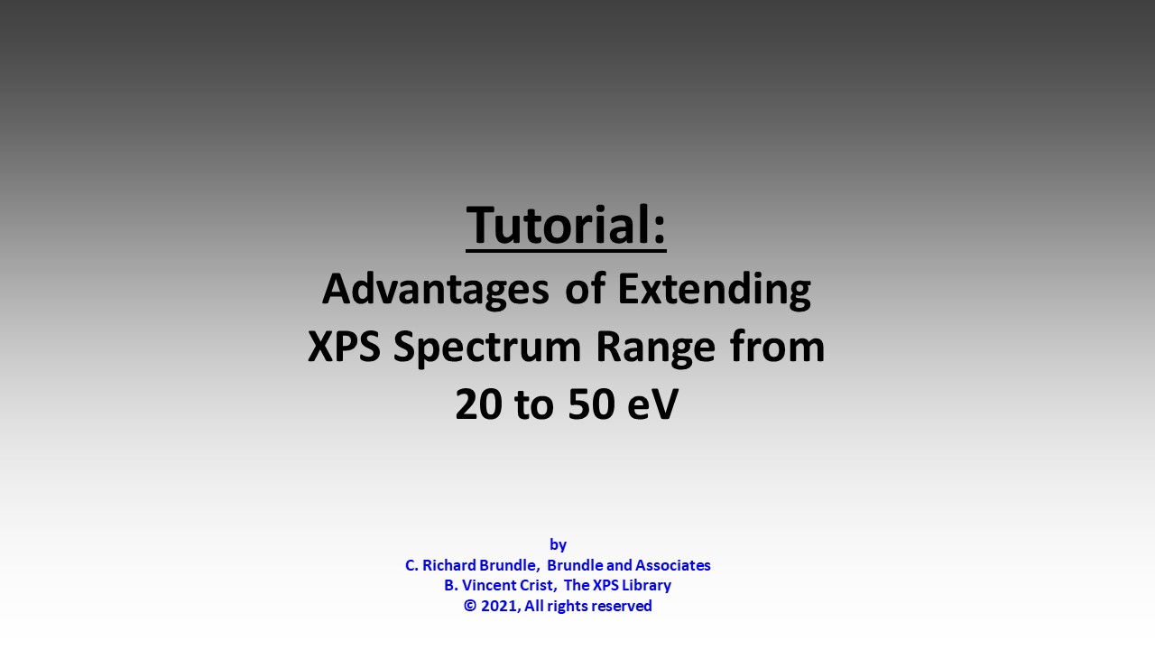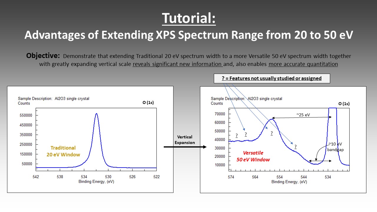 from the traditional 20ev to the more-versatile 50ev window providing more information and a window for improving atom% quantitation for new XPS instruments that have very significant improvements in counting rates, saving time.