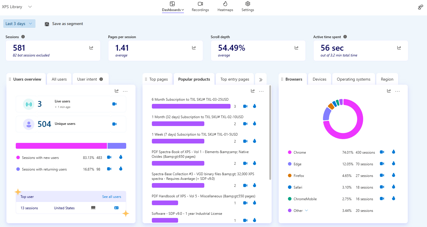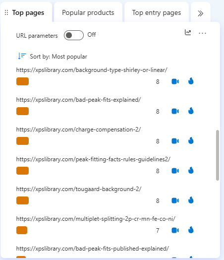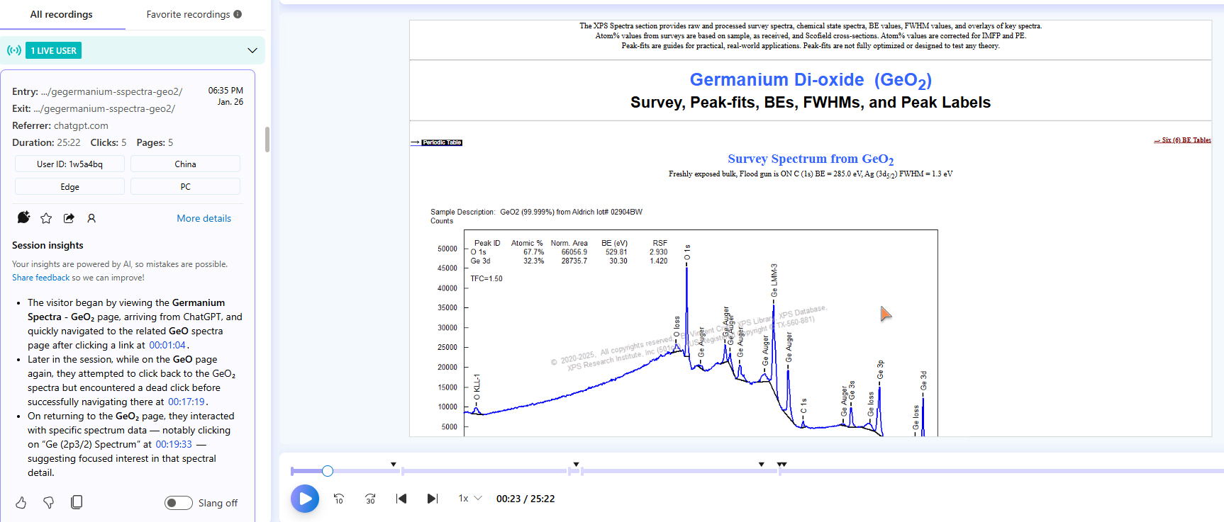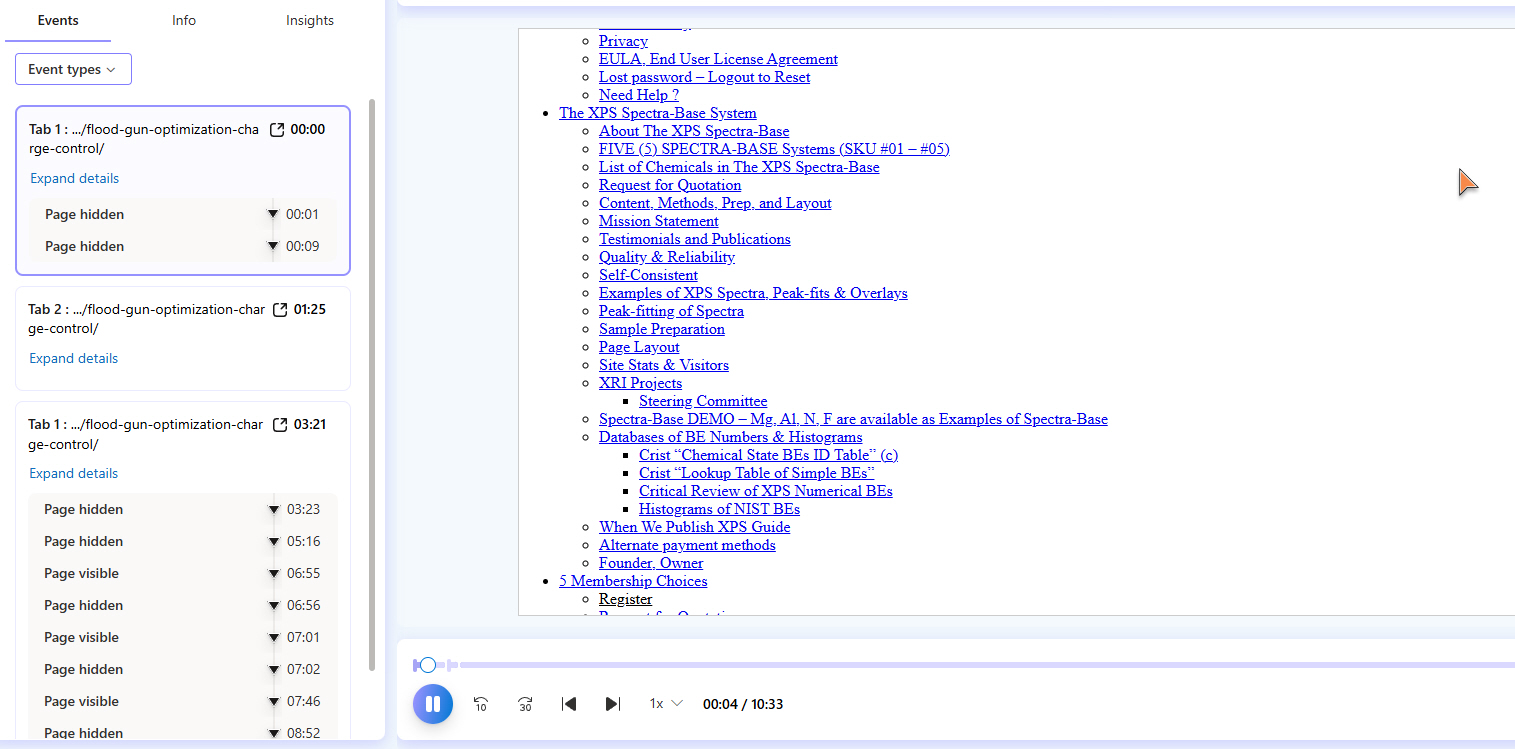 | Just below this, there are screen captures of the real-time on-line software that allows me to truly “SEE” in real-time and from recordings what Graduate Students are looking for when they visit “The XPS Library” and “The International XPS Spectra-Base” |