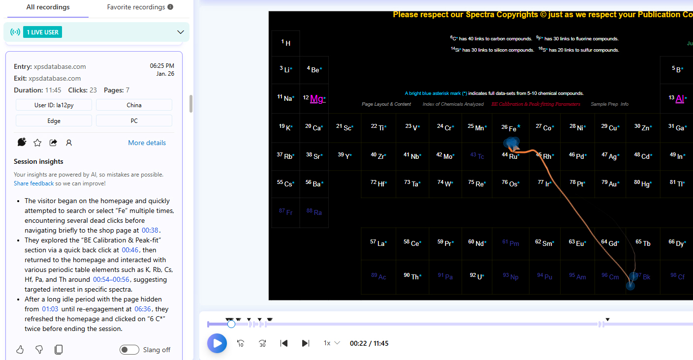 After finalizing both On-Line stores, I discovered a software that allows me to see what is happening on each of my stores. I can see visitors move their mouse in Real-Time and watch them click on tables, element names, and the links. I see visitors click on chemical element abbreviations that have no links and the 4 that have links to demo pages. I see students frustrated because most of the links in the Periodic Table are now turned off. The same for The XPS Library.