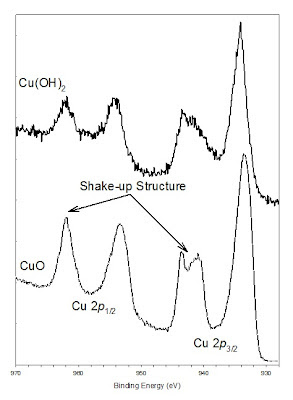 Figure 1. Shake-up structure in Cu 2p spectra of copper (II) hydroxide (Cu(OH)2, top) and copper (II) oxide (CuO, bottom)[2].