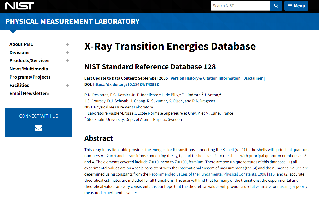 X-ray Transition Energies from NIST Physical Measurement Laboratory – Values updated on September 2005